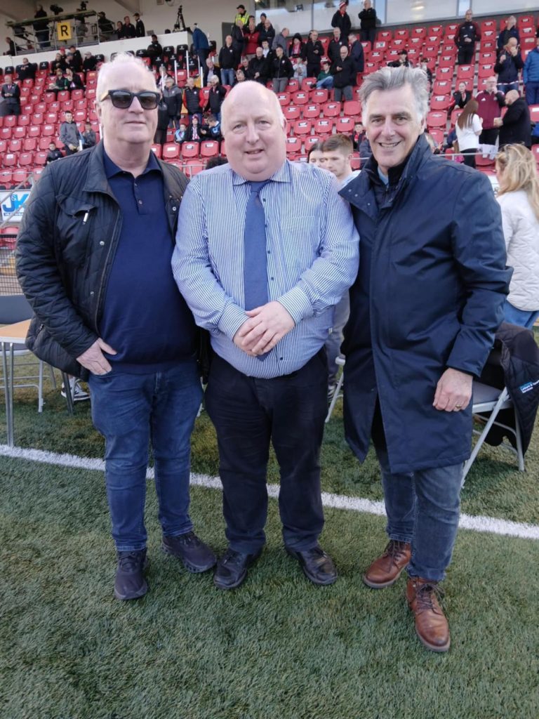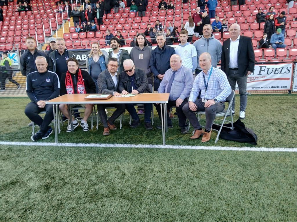 On behalf of DCFC The Peace Pitch Peace Declaration Certificate was signed by life-long Candy Stripes supporters and inspiration for the first peace pitch in the League of Ireland Premiership Division, Eamonn Baker and Richard Moore. At the time of this picture, unfortunately, Eamonn was too poorly to attend. However, Eamonn did sign the Declaration on the morniong of the event from his bedside at Cornfields Care Centre, Limavady.