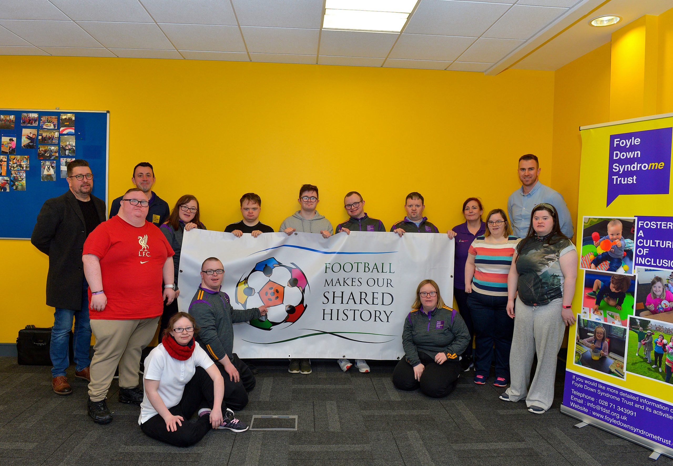 Group pictured in the Foyle Down Syndrome Trust’s offices in The Shared Future centre, Waterside, on Monday afternoon last, at the launch of the National Children’s Football Alliance sponsored ‘Football makes our Shared History ‘project. Included in the photograph are Ernie Brennan, managing director, National Children’s Football Alliance, on the left, staff members Conor McGilloway and Sue McElwee and Christopher Cooper, manager FDST. Photo: George Sweeney. DER2206GS – 066